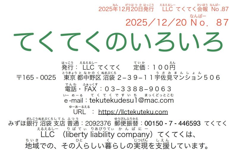 会報『てくてくのいろいろ』 2026.02.18 2021.07.15 LLCてくてくでは、利用者、スタッフ、読者、皆様の力添えを頂きながら、会報 『てくてくのいろいろ』を発行しています。『てくてくのいろいろ』最新号の内容の一部をご紹介します。画像をクリックするとPDFが開きます👇